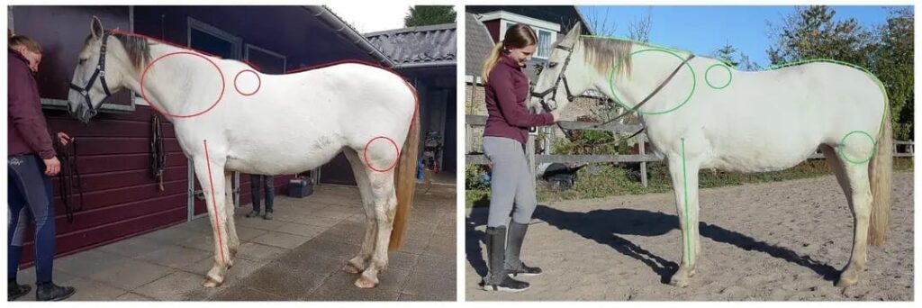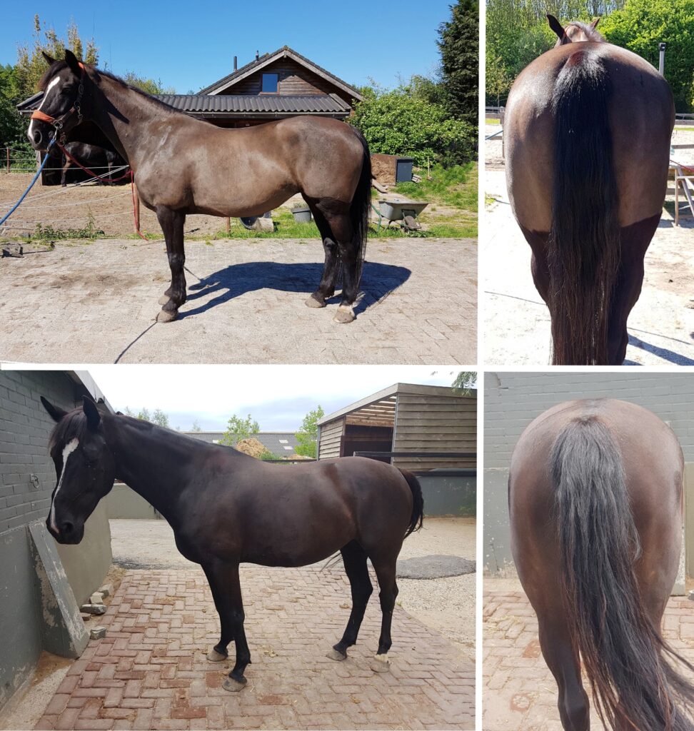 Bovenstaand zie je foto’s van de fysieke verschillen bij deze witte merrie na vijf maanden training door Sterre onder begeleiding van Susanne, aangevuld met gericht bodywork. Onderstaand zie je foto’s van de fysieke verschillen bij deze zwarte merrie na drie maanden training door Susanne, aangevuld met gericht bodywork.